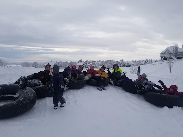 We spent the whole morning getting things all picked up around the house, and I did some grocery shopping as well. The boys didn't have school because of the holiday and I wanted to take them to do an activity in the late afternoon. In my head I was thinking of a trampoline park or something like that. Well at the last minute my friend Jenny Noall text me with a picture of her truck all packed packed up with tubes, inviting us to go with her. We jumped on the invitation. Especially since it had snowed like crazy that whole day. So there was a ton of fresh snow.